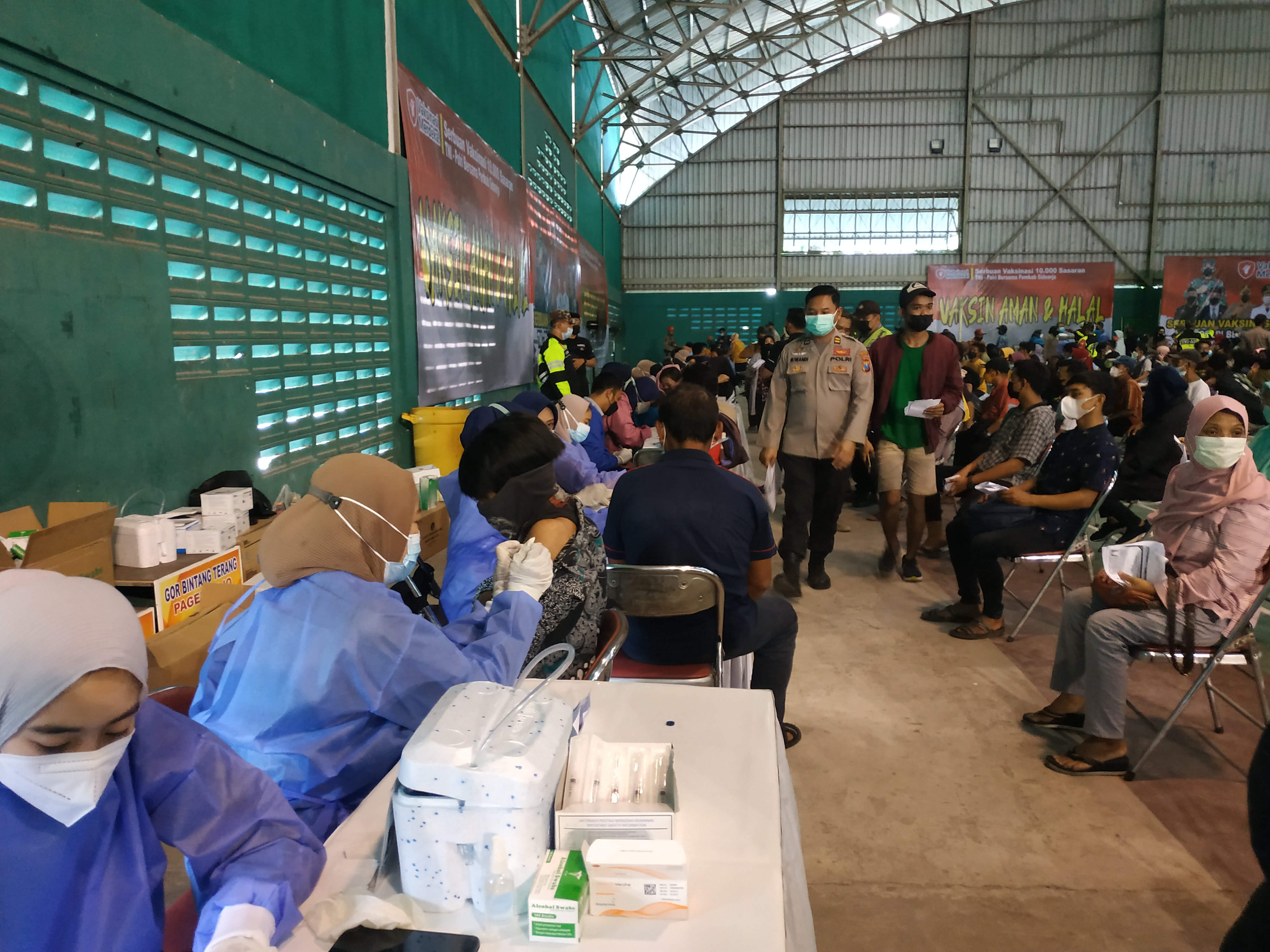 Di dalam gedung Tennis Indoor vaksinasi merdeka sedang berjalan dengan target sasaran sampai 10.000 orang. "Hari ini kita siapkan vaksin 7.000 - 10.000 dosis untuk masyarakat. Khususnya Pedagang Kali Lima (PKL) dan Lansia," terangnya.
