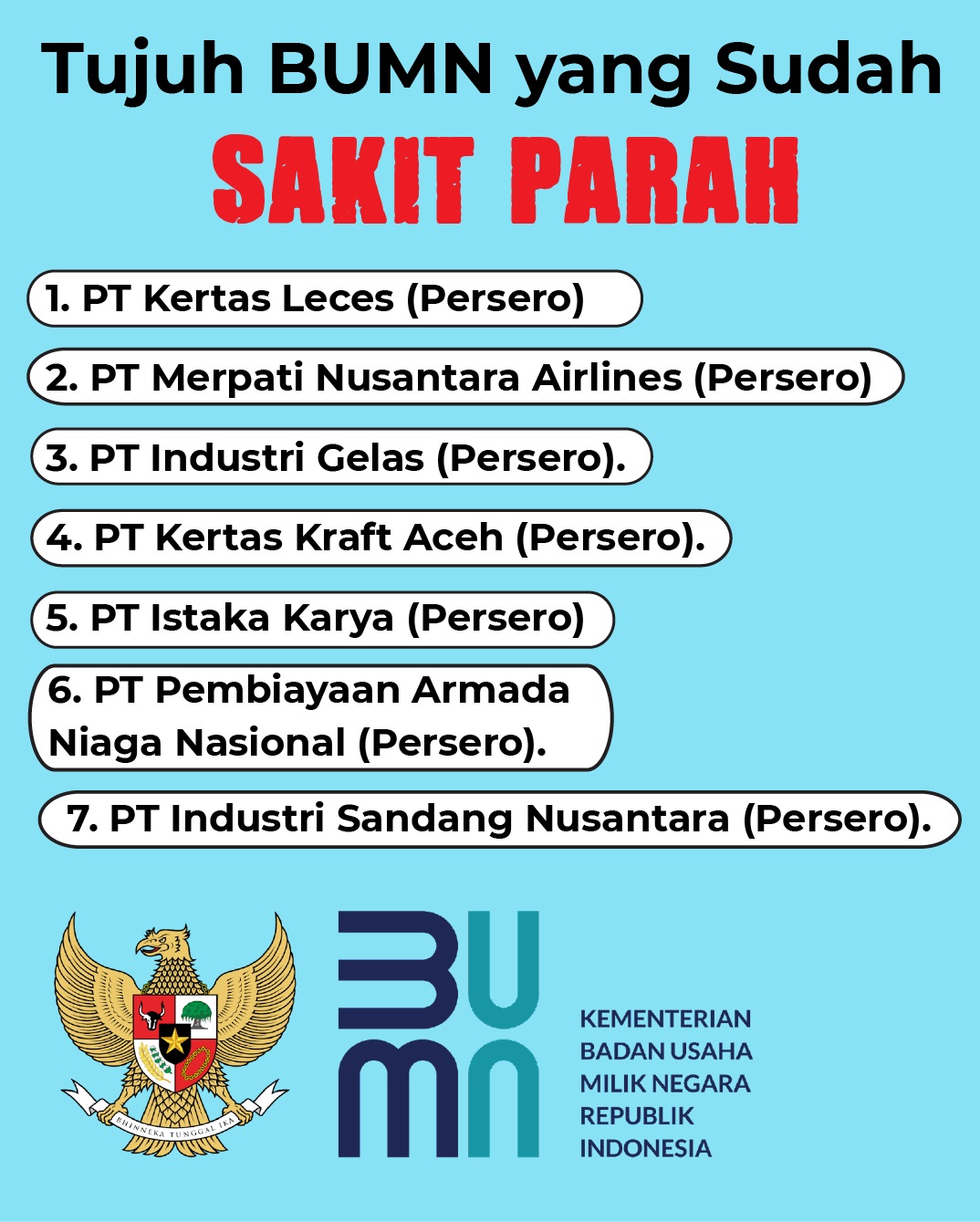 Berdasarkan penelusuran Surabayapagi, ada sekitar tujuh perusahaan pelat merah yang akan dibubarkan. Adapun ketujuh BUMN yang dimaksud adalah PT Kertas Leces (Persero), PT Merpati Nusantara Airlines (Persero), PT Industri Gelas (Persero), hingga PT Kertas Kraft Aceh (Persero). Kemudian, PT Istaka Karya (Persero), PT Pembiayaan Armada Niaga Nasional (Persero), dan PT Industri Sandang Nusantara (Persero).