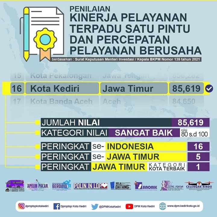 “Kita patut bersyukur karena Kota Kediri telah berhasil meraih predikat Sangat Baik dengan skor 85,61 atas capaian kinerja Percepatan Pelaksanaan Berusaha (PPB) berdasarkan penilaian Kementerian Investasi/BKPM,” terang Edi Darmasto, Kepala DPMPTSP Kota Kediri, Senin (18/10/2021).