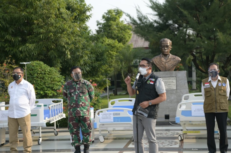 SURABAYAPAGI, Bandung - Badan Usaha Milik Daerah (BUMD) Jawa Barat (Jabar) menyerahkan bantuan berupa 70 tempat tidur rumah sakit kepada Rumah Sakit Dustira, Rabu (7/7/2021). Penyerahan disaksikan langsung Gubernur Jabar Ridwan Kamil.