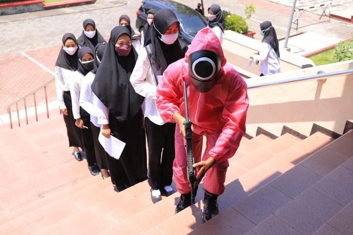 Backsound mencekam khas film serial yang tayang di Netflix itu turut mengiringi pink soldier menghampiri para peserta. Kelima pink soldier yang bertugas dilengkapi juga dengan senjata laras panjang. Bukannya takut, para peserta ujian justru takjub dan memberikan applaus meriah. "Seru banget, bikin seneng," ujar Aini Sholikah, salah satu peserta.