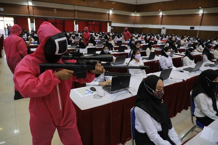 SURABAYAPAGI.COM, Surabaya - Kanwil Kemenkumham Jatim punya cara unik untuk mencairkan ketegangan dalam Seleksi Kompetensi Dasar (SKD) CPNS Formasi Penjaga Tahanan dan Pemeriksa Keimigrasian. Hari ini (20/10) para peserta dihibur dengan panitia yang berdandan ala pink soldier dalam film seri Squid Game.