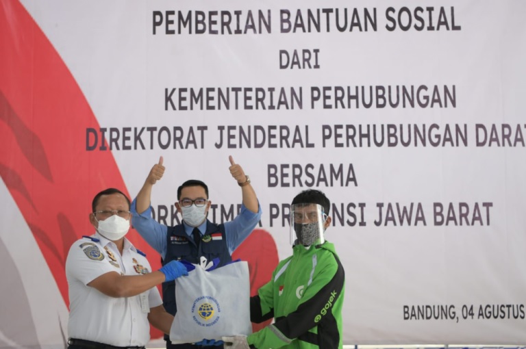 “Khusus di Bandung, menyerahkan kepada saya dan diberikan oleh Pak Gubernur secara simbolis terutama kepada mitra transportasi para pengemudi ojek online, kemudian para pengemudi angkutan kota dan ojek pangkalan,” katanya.