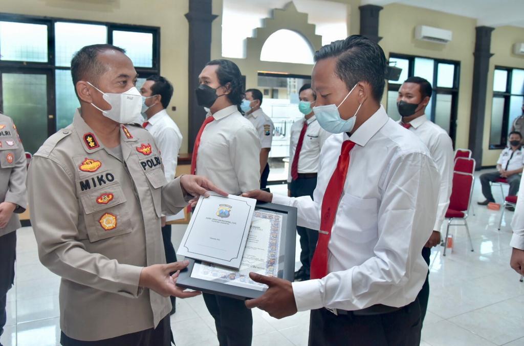 Kapolres Lamongan memberikan piagam penghargaan kepada 11 anggota Sat Narkoba dan 1 orang masyarakat yang membantu pihak Kepolisian dalam mengungkap kasus peredaran narkoba jenis ganja 1 Kg dan sabu 135,07 gram di wilayah hukum Polres Lamongan.