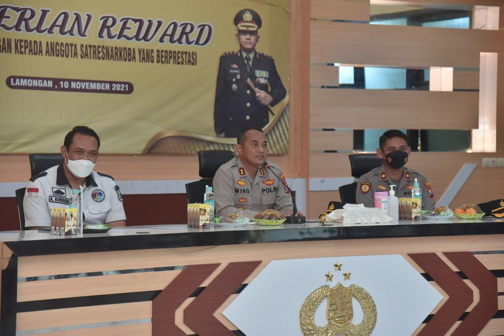 SURABAYAPAGI, Lamongan - Kapolres Lamongan AKBP Miko Indrayana, S.I.K memberikan penghargaan/reward kepada anggota Sat Narkoba Polres Lamongan yang berprestasi dan kepada masyarakat yang telah membantu tugas Kepolisian, bertempat di gedung SKJ Mapolres Lamongan pada Jumat (12/11) pagi.