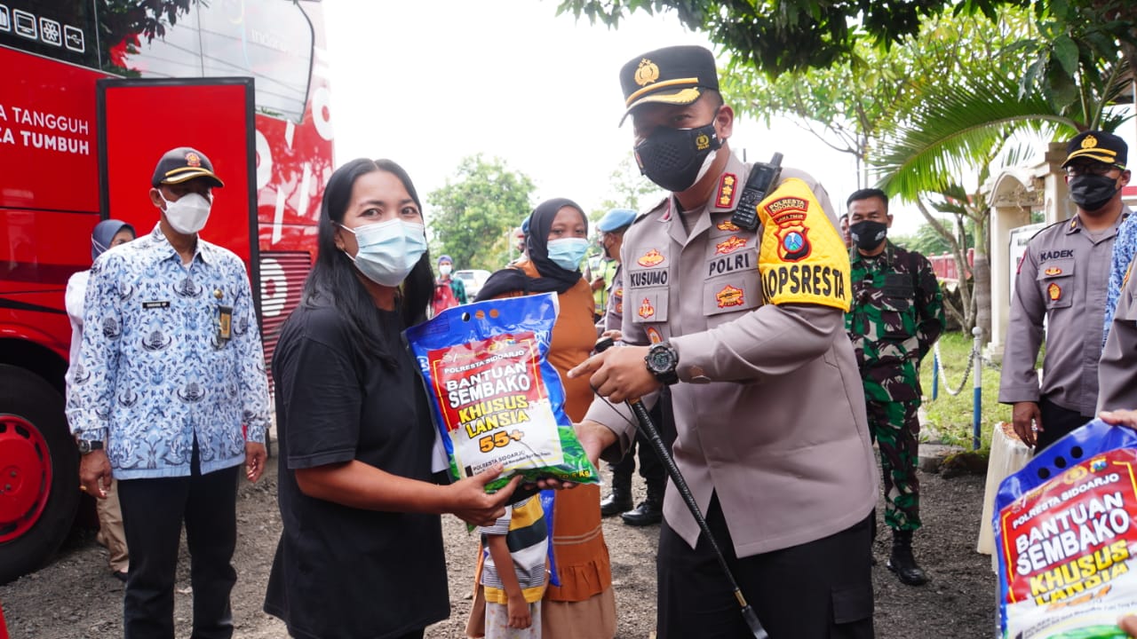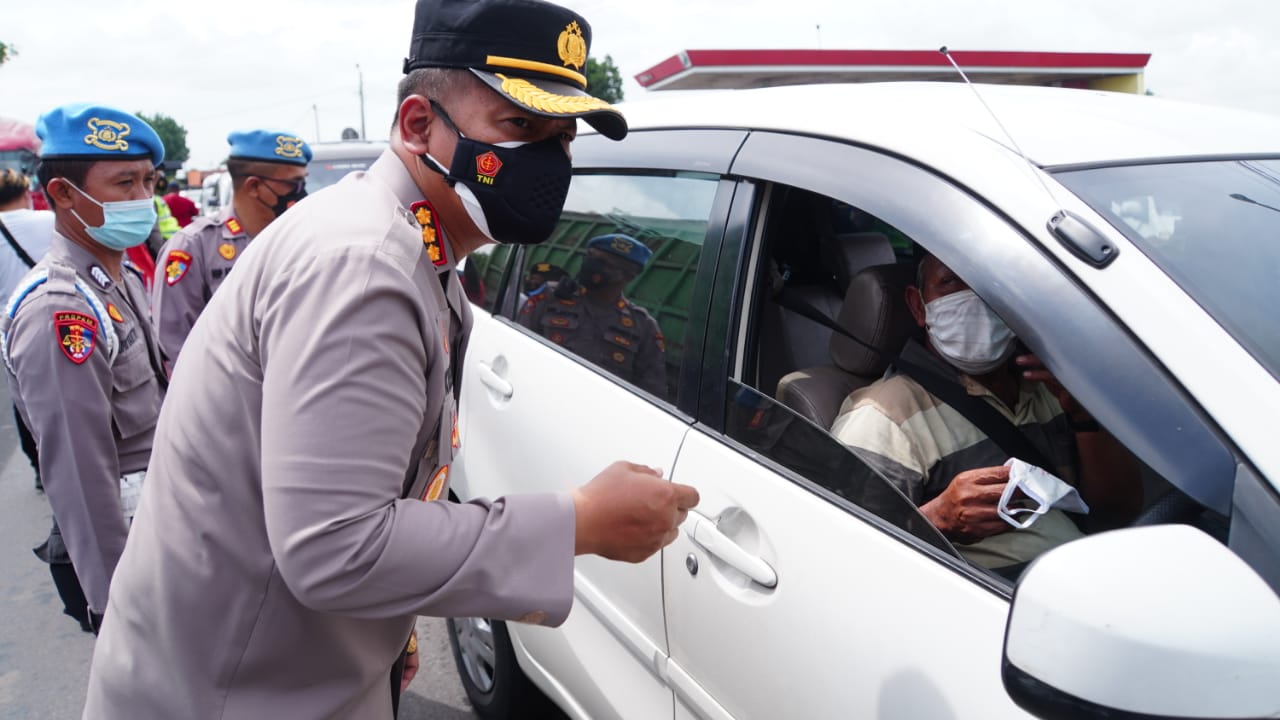 Berdiri di tepi jalan beberapa polisi wanita membawa berbagai pesan himbauan bagi pengendara, agar selalu tertib lalu lintas dan disiplin protokol kesehatan. Dan polisi lainnya membagi-bagikan masker. Tampak pula Kapolresta Sidoarjo Kombes Pol. Kusumo Wahyu Bintoro menghampiri pengendara, sekedar mengingatkan patuhi peraturan tertib lalu lintas dan tetap memakai masker.