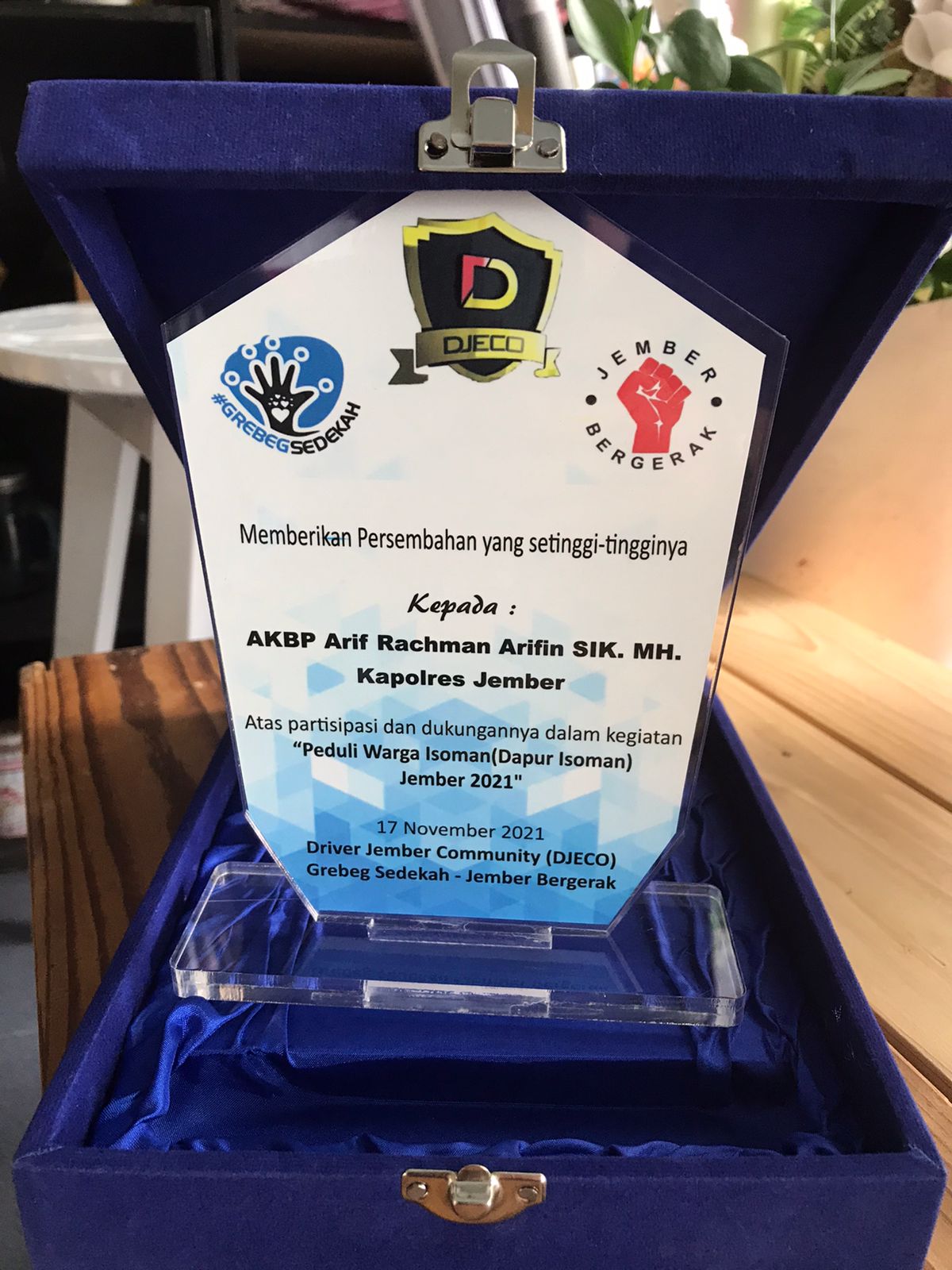 Tak hanya itu saja, Kapolres Jember sekaligus mendapatkan penghargaan atas partisipasinya dalam kegiatan Peduli Warga Isoman dengan membuat Dapur Isoman oleh Driver Jember Community (OJECO), Komunitas Grebek Sedekah dan Komunitas Jember Bergerak (17/11/2021) di Mapolres Jember.
