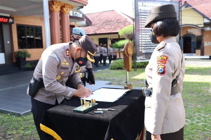 Setelah proses serah terima dan penandatanganan Surat Keputusan alih tugas oleh Kapolres Blitar Kota dari Waka yang lama ke Waka Polres Blitar Kota yang baru, orang nomor satu di Polres Blitar Kota ini melepas cepuk jabatan dari Kompol Pratolo dipasangkan ke Kompol Eusebia Torimtubun Lempitenan.