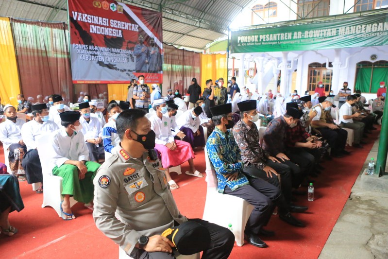 Untuk Jawa Timur, vaksinasi berlangsung di Pondok Pesantren (Ponpes) Ar-Rowiyah Macingan, Desa Langpanggang, Kecamatan Modung, Kabupaten Bangkalan, yang diikuti Kapolri Jenderal Listyo Sigit Prabowo secara Virtual.
