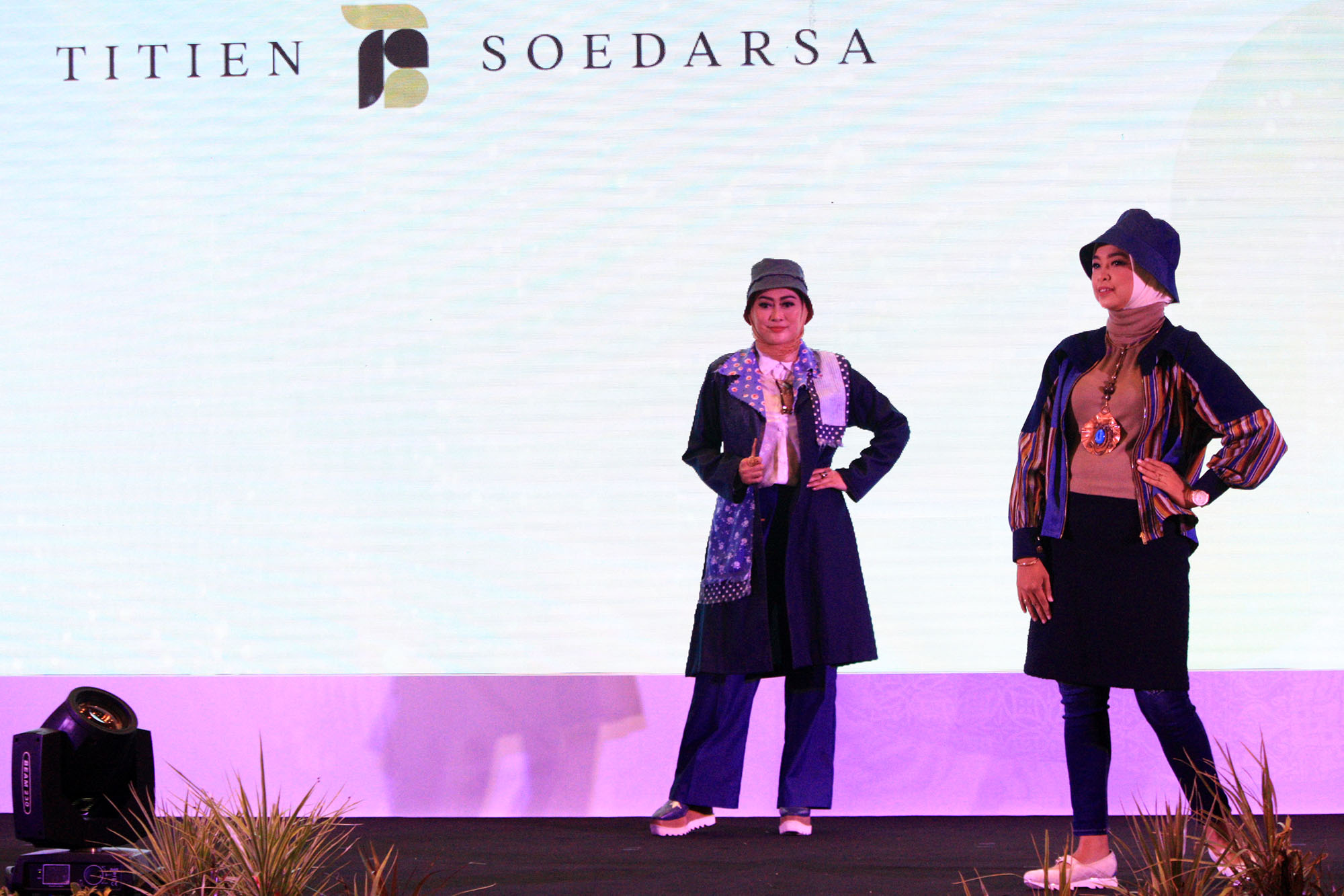 Model memperagakan busana Etnic On The Denim Style" rancangan Titin Soedarsa saat fashion show di Grandcity Convention Hall, Kota Surabaya, Jawa Timur, Sabtu (28/11/2021). Peragaan busana tersebut menampilkan 9 outfit yang terdiri dari outer, jaket dan overall dengan tampilan urban milenial trendi denim dan etnik Indonesia yang di padukan menjadi satu keunikan, fashionable, dan trendy Kain tenun tradisional yang kaya akan motifnya dan kain denim yang didesain sederhana menjadi gaya fashion masa kini yang modern dan berbudaya dikombinasi wastra batik Nusantara, tenun dan lurik .SP/Patrik