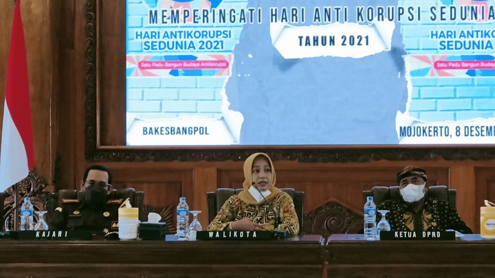 Ucapan kejujuran orang nomor satu di Pemkot Mojokerto itu terlontar saat Silaturahmi Forkopimda dengan puluhan murid SMP Negeri dan Swasta se Kota Mojokerto dalam rangka memperingati Hari Anti Korupsi Sedunia, di Ruang Nusantara Pemkot Mojokerto, Rabu (8/12/2021) sore.