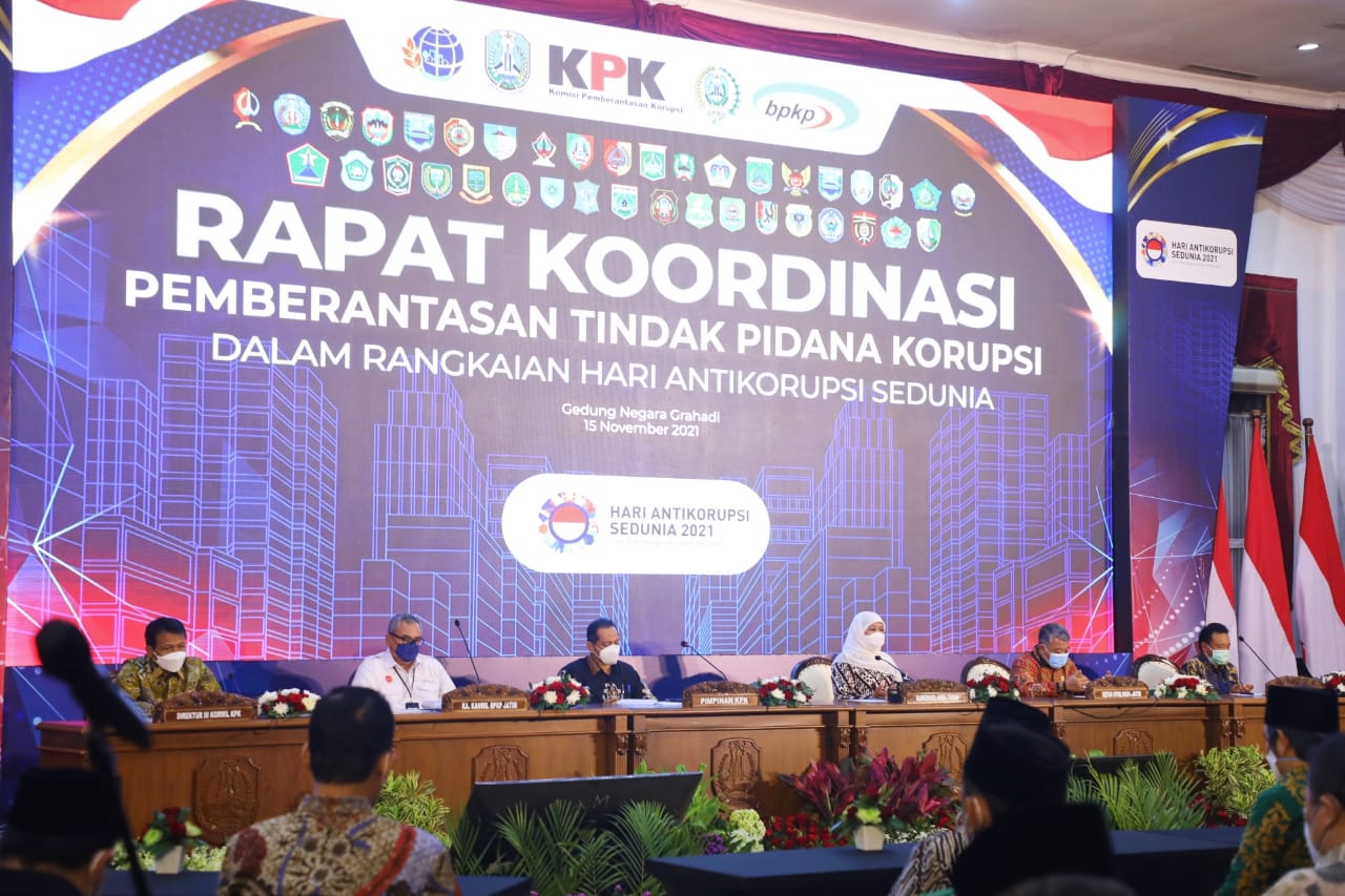 Khofifah mengatakan, peringatan Hari Anti Korupsi Sedunia 9 Desember ini harus dijadikan momentum bagi seluruh jajaran Pemprov Jatim dan Kabupaten/ Kota se- Jatim untuk kembali memperkuat integritas dan komitmen untuk tidak mendekati apalagi melakukan praktik-praktik korupsi.