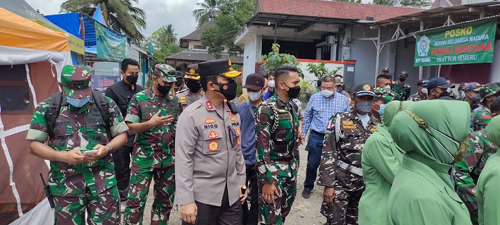 SURABAYAPAGI.COM, Lumajang - Kapolda Jatim, Irjen Pol Nico Afianta mendampingi peninjauan yang dilakukan oleh Kepala Staf Angkatan Darat, Jenderal TNI Dudung Abdurachman di posko pengungsi yang berada di Lapangan Candipuro, Kecamatan Candipuro, Kabupaten Lumajang, Jawa Timur. Senin (13/12) pagi.