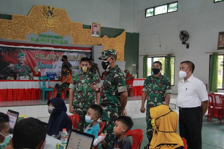 SURABAYAPAGI.COM, Lamongan - Pemkab Lamongan sudah menargetkan anak umur 11-16 tahun harus sudah divaksin. Pelaksanaan vaksinpun dilakukan dengan masif. Berbagai lembaga pendidikan dan elemen ikut andil mensukseskan vaksinasi ini, salah satunya Kodim 0812 Lamongan.