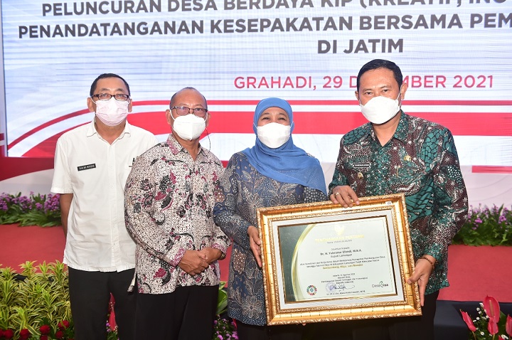 Bupati menerima penghargaan bersamaan dengan Gubernur Jatim Khofifah Indar Parawansa dan 29 kabupaten/kota di Jatim. Bupati yang akrab disapa Pak Yes menerima penghargaan percepatan pembangunan desa tahun 2021.