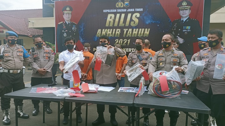 "Kita amankan dua orang pelaku, LT (31) dan DM (27), warga Kecamatan Gedeg, Kabupaten Mojokerto. Satu pelaku lain berinisial P masih dalam pengejaran dan masuk daftar pencarian orang (DPO)," terangnya saat jumpa pers di halaman Mapolresta Mojokerto, Kamis (30/12) siang.