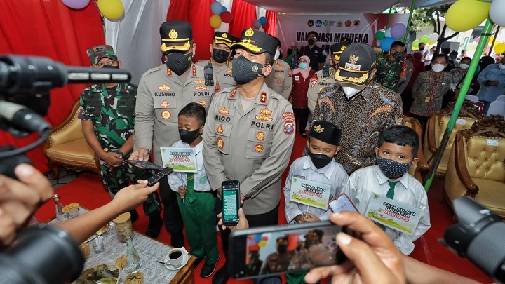 "Untuk hari ini jajaran Polda Jawa Timur serentak melaksanakan vaksinasi merdeka anak. Dengan sasaran sebanyak 19.200 dosis. 10.600 dosis di khusus untuk anak-anak" penjelasan Irjen Nico