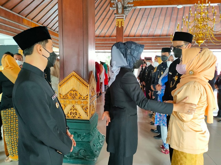 Tercatat, sebanyak 10 orang pejabat setingkat eselon III diambil sumpah jabatan menjadi eselon II oleh Bupati Mojokerto, Ikfina Fahmawati di Pendopo Graha Maja Tama, Kantor Pemkab Mojokerto, Jumat (21/2/2022) sore.
