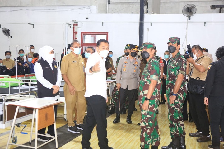 Hari ini, Senin (7/2/2022), Gubernur Jatim Khofifah Indar Parawansa, Pangdam V/Brawijaya Mayjend TNI Nurchahyanto, Kapolda Jatim Irjen Pol Nico Afinta, Pangkoarmada II Laksda TNI Iwan Isnurwanto, dan Kajati Jatim Mohamad Dofir, serta Walikota Surabaya Eri Cahyadi, melakukan pengecekan di tempat Isoter, untuk wilayah Surabaya Raya yang berada di Asrama Haji Sukolilo dan Rumah Sakit Darurat Lapangan Tembak Surabaya.
