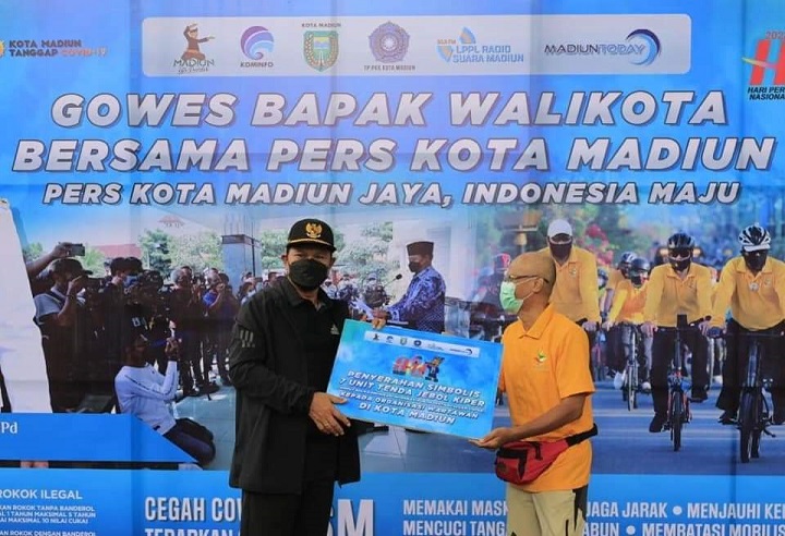 Dalam gowes bareng wartawan kemarin walikota H.Maidi membagikan paket sembako kepada warga kota Madiun yang sedang berada di jalan, selain itu kepada insan pers walikota juga memberikan bantuan tenda. Ani/Aan