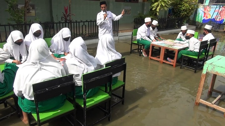 Para siswa MI ini duduk di meja dan kursi yang sudah tertata rapi di halaman sekolah yang terendam banjir setinggi lebih kurang 10 cm. Sambil bertelanjang kaki, anak-anak ini duduk diatas kursi yang berada di halaman sekolah dan mendengarkan penjelasan dari guru mereka tentang kesiapsiagaan terhadap banjir. "Meski belajar di atas banjir, tapi saya senang," kata Tiara salah seorang siswa MI Islamiyah.