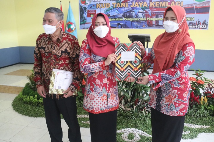 SURABAYAPAGI.COM, Mojokerto - Bupati Mojokerto Ikfina Fahmawati membuka secara langsung Rapat Anggota Tahunan (RAT) 2022 Koperasi Unit Desa (KUD) Tani Jaya Kemlagi di Gedung KUD Tani Jaya, Desa Kemlagi Kulon, Kecamatan Kemlagi, Kabupaten Mojokerto, Rabu (16/02) pagi. Agenda rapat tersebut dalam rangka membahas terkait pertanggungjawaban Pengurus dan Pengawas KUD Tani Jaya Kemlagi Tahun Buku 2021.