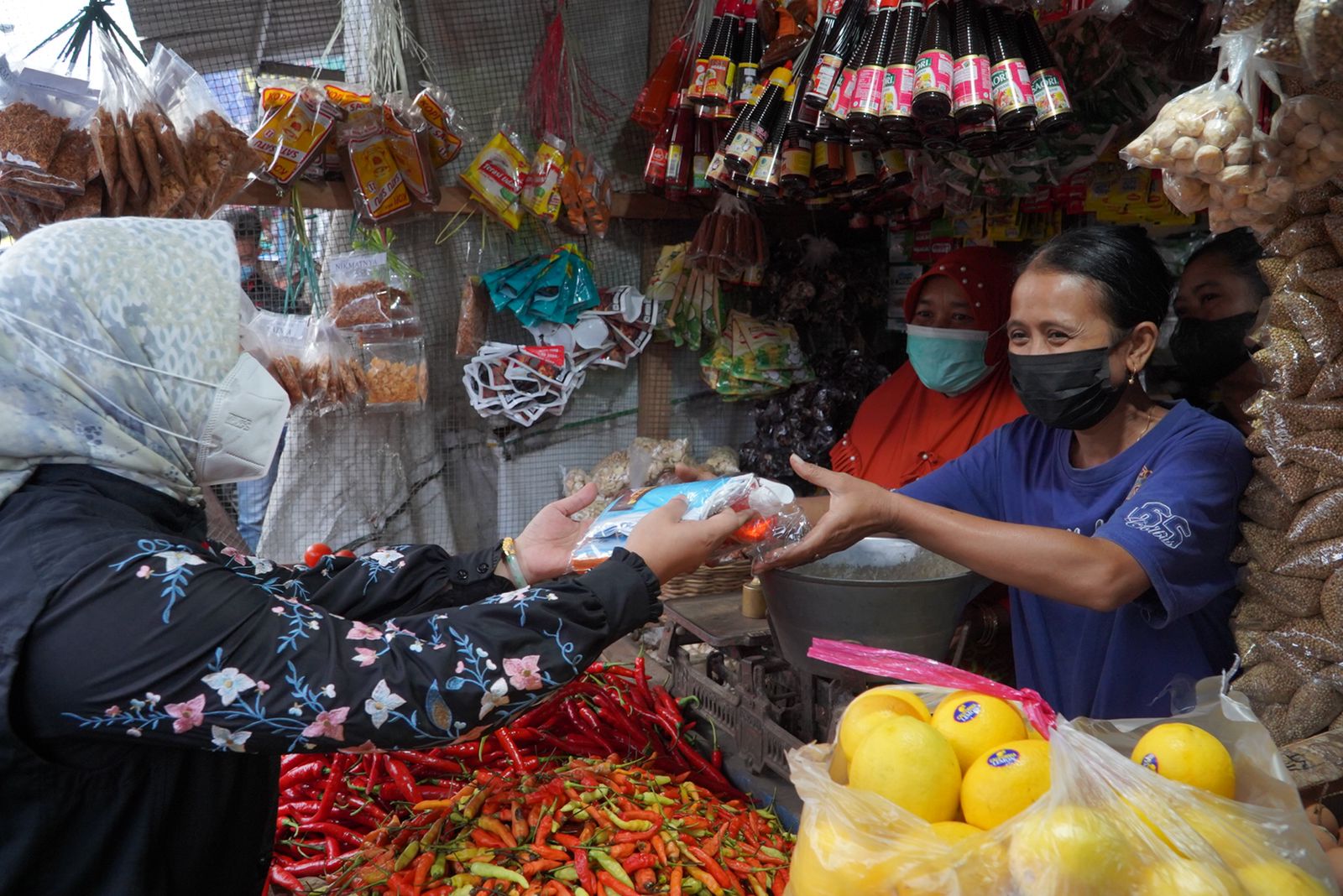 SURABAYAPAGI.COM, Mojokerto - Guna mengantisipasi lonjakan kasus varian omicron Covid-19, Satuan Tugas (Satgas) Covid-19 Kota Mojokerto yang terdiri dari Pemkot Mojokerto, TNI dan POLRI membagikan ribuan paket masker, hand sanitizer, dan sabun kepada para pedagang di Pasar Tanjung Anyar dan pusat pertokoan serta wisata kuliner, Jalan Majapahit, Jum’at, (18/2/2022) sore.