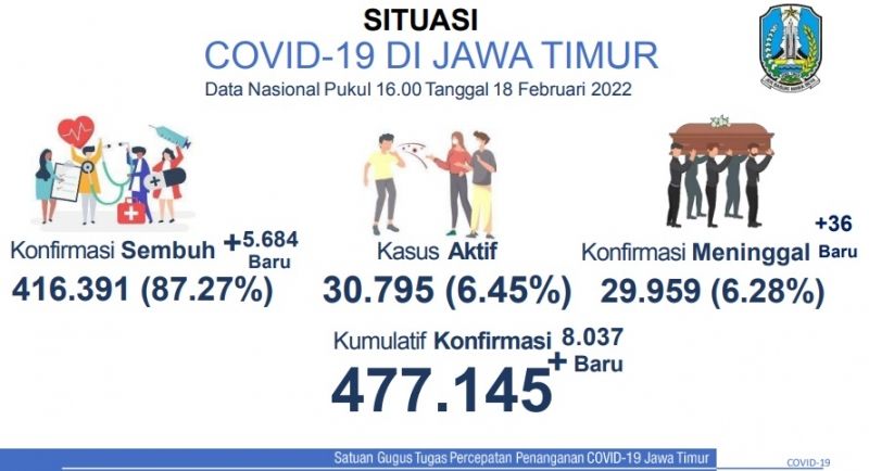 SURABAYA PAGI, Surabaya - Kasus Covid-19 di Jawa Timur bertambah 8.037 pada Jumat(18/2/2022). Kini, kasus aktif Covid-19 di Jatim sebanyak 30.795. Data dari Satgas Covid-19 Jatim, ada 2 Kabupaten/Kota yang saat ini memiliki kasus aktif Corona di atas 1.000.