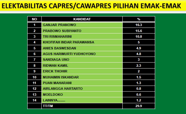 Ditambahkannya, survey elektabilitas untuk mengetahui potensi dari nama-nama capres yang sudah beredar di tengah masyarakat. Wajar jika kemudian riset yang digelar menggunakan responden dari kalangan emak-emak ini memunculkan sosok emak-emak pula. rko