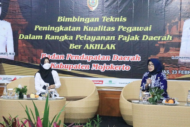 SURABAYAPAGI.COM, Mojokerto - Bupati Mojokerto Ikfina Fahmawati menjadi narasumber dalam agenda Bimbingan Teknis (Bimtek) Peningkatan Kualitas Pegawai Badan Pendapatan Daerah (Bapenda) Kabupaten Mojokerto, Rabu (23/2). Dalam kesempatan ini, Ikfina memberikan materi dan motivasi untuk para pegawai baik ASN maupun non-ASN untuk menerapkan core values BERAKHLAK yang telah ditetapkan oleh pemerintah pusat.