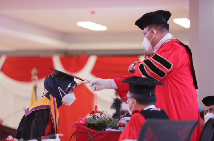 Para wisudawan hadir secara langsung ke lokasi wisuda tanpa didampingi orang tua atau keluarga dan wajib melakukan swab antigen sebelum mengikuti prosesi wisuda. Sementara orang tua atau keluarga wisudawan dapat menyaksikan prosesi melalui siaran langsung.