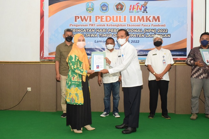 SURABAYAPAGI.COM, Lamongan - Masih dalam upaya membangkitkan sektor ekonomi pasca pandemi, Persatuan Wartawan Indonesia (PWI) Jawa Timur dan Lamongan bersama Pemkab setempat, menggelar bakti sosial pengurusan legalitas Perijinan Industri Rumah Tangga (P-IRT ) bagi ratusan pelaku pelaku Industri Kecil Menengah (IKM) dan Usaha Mikro Kecil Menengah (UMKM).