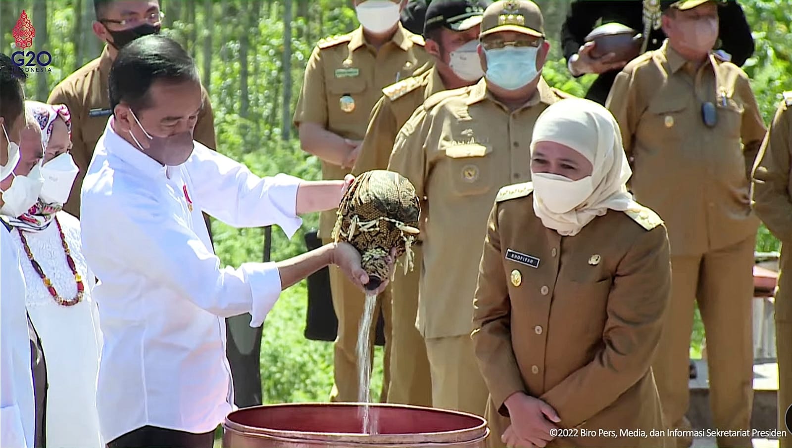 Usai mengikuti prosesi penyatuan tanah dan air bersama Presiden Jokowi, Gubernur Khofifah dan 33 gubernur lainnya melakukan penanaman pohon di sekitaran kawasan Titik Nol IKN.