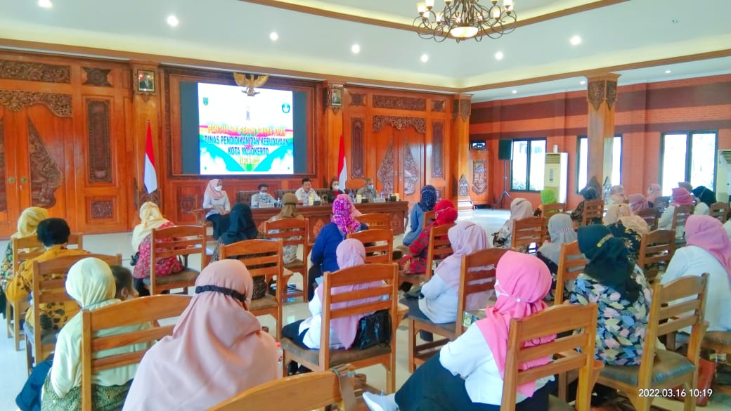 Guna meningkatkan kualitas PAUD, Dinas Pendidikan dan Kebudayaan Kota Mojokerto melaksanakan bimbingan teknis (bimtek) penguatan peran bunda PAUD Kecamatan dan Kelurahan se Kota Mojokerto di Gedung Sabha Mandala Madya, Pemkot Mojokerto, Rabu (16/3/2022) pagi.
