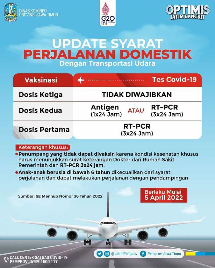 Ketentuannya tertuang dalam Surat Edaran (SE) Satgas Penanganan Covid-19 Nomor 16 Tahun 2022 tentang Ketentuan Perjalanan Orang Dalam Negeri dalam Masa Pandemi Covid-19, yang terbit 2 April.