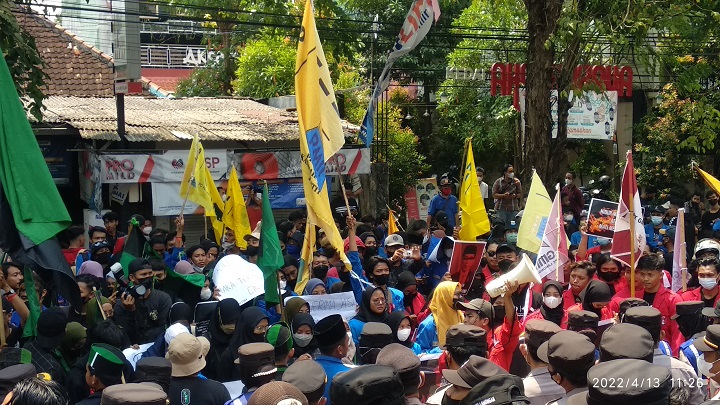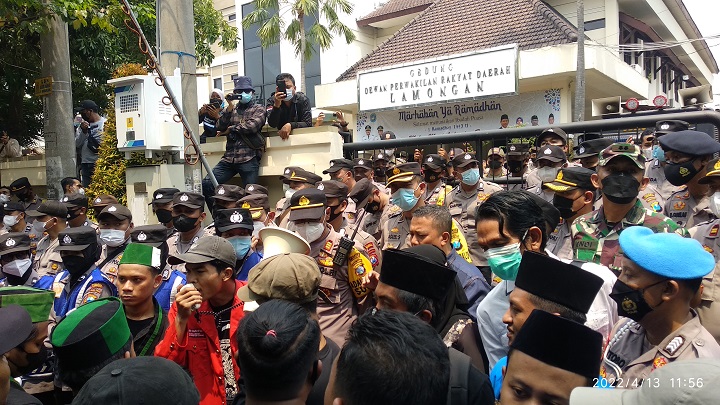 Bertempat di gedung DPRD Lamongan, ratusan mahasiswa gabungan dari tiga elemen yakni PMII, HMI, dan GMNI, Rabu (13/4/2022), menggelar aksi unjuk rasa, menyampaikan empat tuntutan, menolak wacana amandemen UUD 1945 dan wacana penundaan Pemilu, menolak kenaikan harga BBM, menolak kenaikan harga minyak goreng, dan menolak kenaikan PPN.