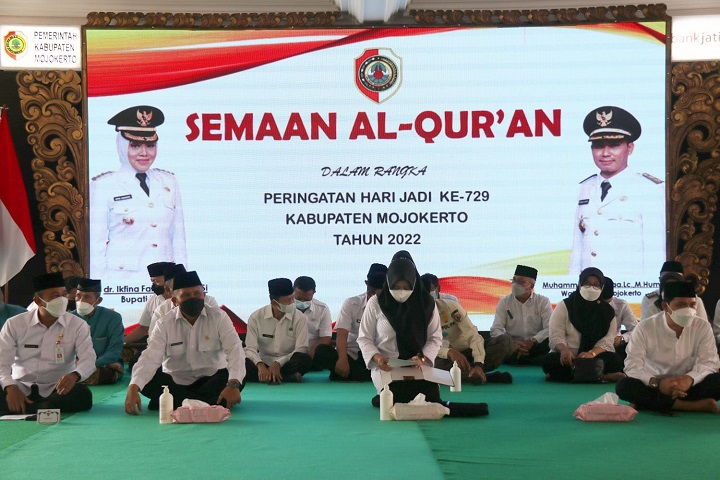 SURABAYAPAGI.COM, Mojokerto - Dalam menyambut Peringatan Hari Jadi Kabupaten Mojokerto ke 729 tahun 2022, Pemerintah Kabupaten (Pemkab) Mojokerto menggelar Sema’an Al-Qur’an sebagai wujud rasa gembira dan syukur kepada Allah SWT, serta ungkapan rasa terima kasih kepada para pejuang pendahulu, terutama para perintis berdirinya Kabupaten Mojokerto.