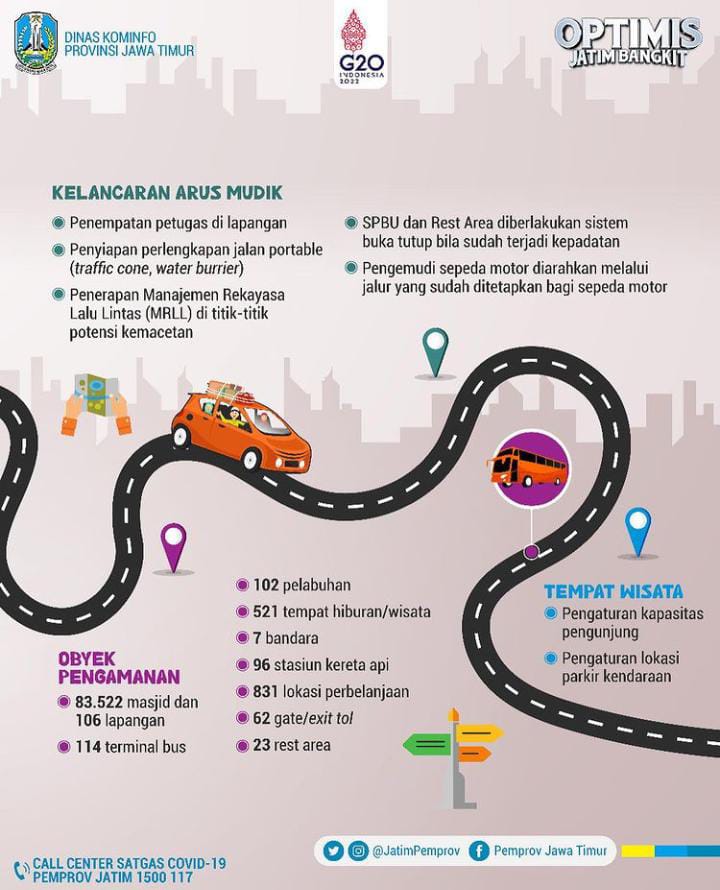 Sementara itu, Forum Komunikasi Pimpinan Daerah Pemprov Jatim (Forkopimda Jatim) menyiapkan 200 Posko Mudik Lebaran 2022. Lokasi posko itu tersebar di seluruh wilayah Jatim di 38 kabupaten/kota.