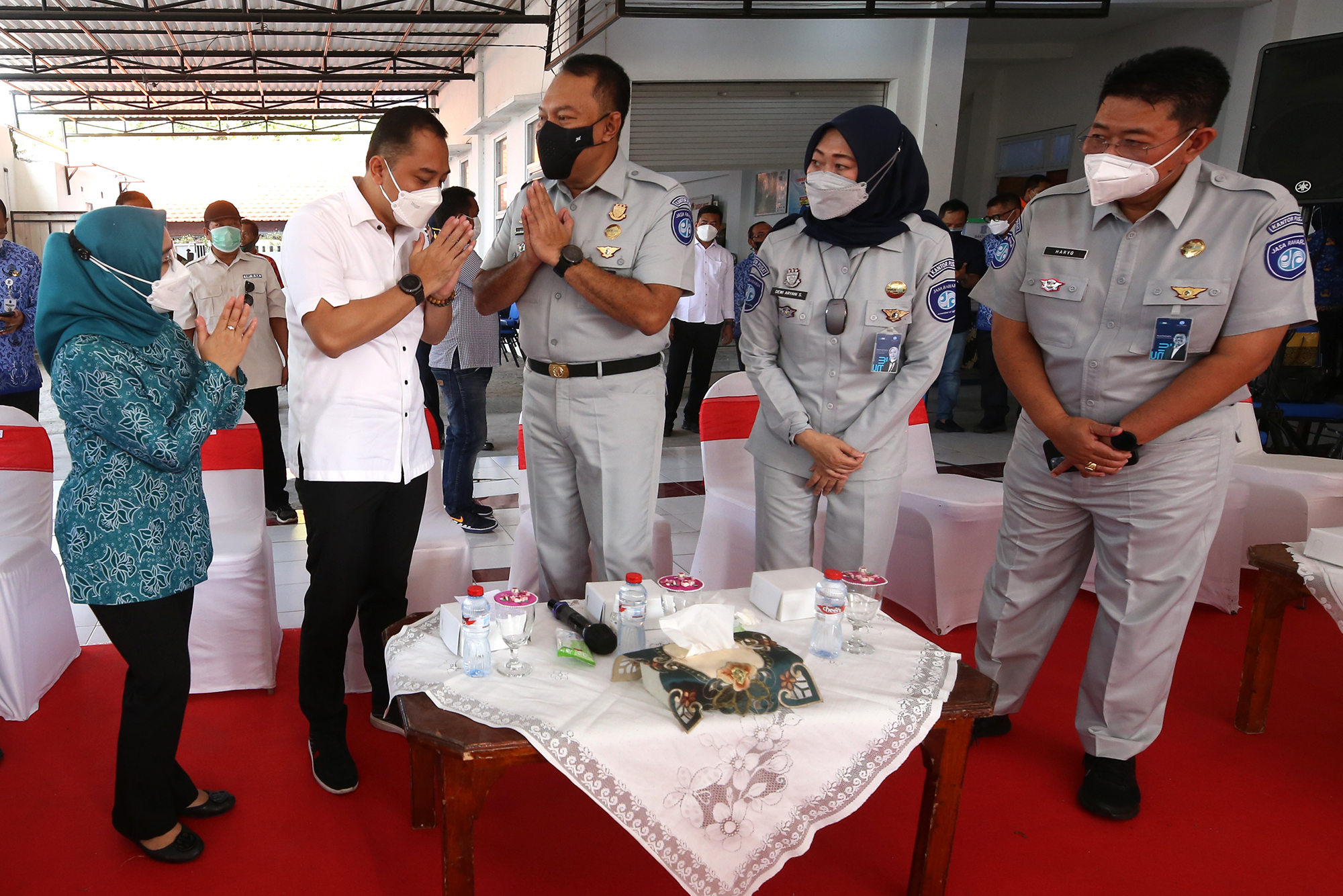 SURABAYAPAGI, Surabaya - Direktur Utama PT Jasa Raharja Rivan Achmad Purwantono bersama Wali Kota Surabaya Eri Cahyadi dan jajaran Asisten serta PD di lingkup Pemerintah Kota (Pemkot) memberikan santunan kepada keluarga korban kecelakaan bus di Kantor Kelurahan Benowo, Kecamatan Pakal, Selasa (17/5).