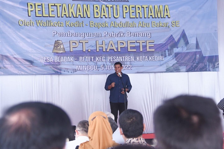 SURABAYAPAGI.COM, Kediri - Wali Kota Kediri Abdullah Abu Bakar meletakkan batu pertama pembangunan PT. HAPETE, Minggu (5/6/2022). Pembangunan PT. HAPETE ini terletak pada kawasan peruntukan industri di Kelurahan Blabak dan Kelurahan Betet.