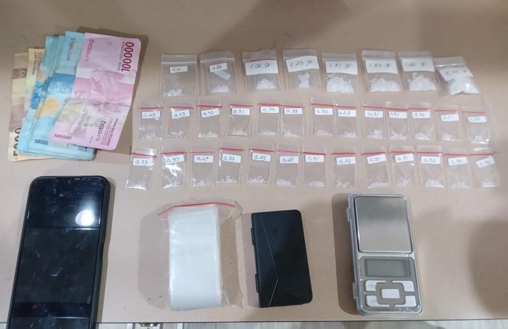 Dari keduanya, polisi berhasil mengamankan barang bukti, 34 poket plastik yang berisi kristal warna putih berupa narkotika jenis sabu-sabu.