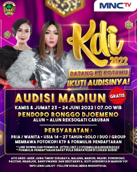 SURABAYA PAGI, Madiun- Pioner Ajang pencarian bakat penyanyi dangdut pertama, Kontes Dangdut Indonesia (KDI) 2022 kembali menggelar audisi di 5 kota besar, yakni Madiun (23-24 Juni), Makassar (2-3 Juli), Medan (16-17 Juli), Wonosobo (22-24 Juli) , dan Jakarta (30-31 Juli).