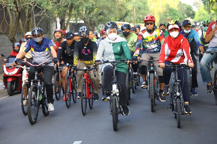 SURABAYAPAGI.COM, Mojokerto - Memeriahkan Hari Jadi Kota Mojokerto ke-104, Gubernur Jawa Timur Khofifah Indar Parawansa secara khusus ikut gowes bersama ribuan warga Kota Mojokerto, Minggu (26/6).