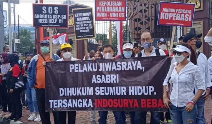 Puluhan korban kasus Koperasi Simpan Pinjam (KSP) Indosurya melakukan aksi unjuk rasa atau demo di depan Mabes Polri, Jakarta Selatan. Tuntutan massa meminta keadilan agar kasus ini segera disidangkan dengan melengkapi berkas perkara sesuai petunjuk Jaksa Penuntut Umum (JPU).