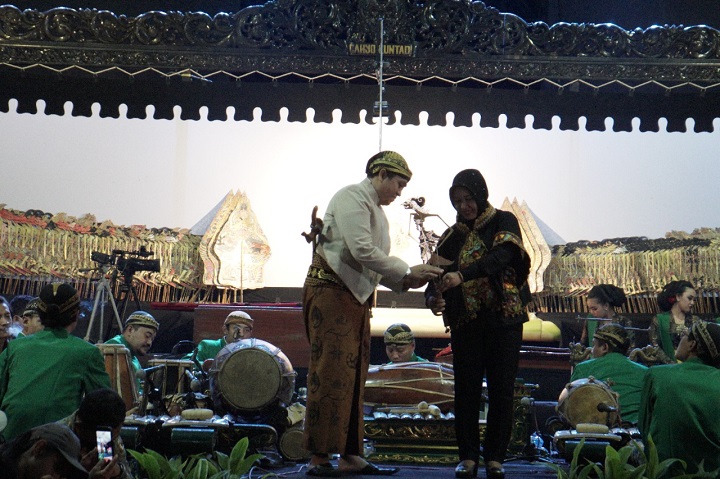 Penyerahan tokoh wayang srikandi oleh Wali kota Mojokerto Ika Puspitasari kepada dalang Ki Cahyo Kuntadi menandai dimulainya pagelaran wayang dengan lakon srikandi kridho tadi malam.