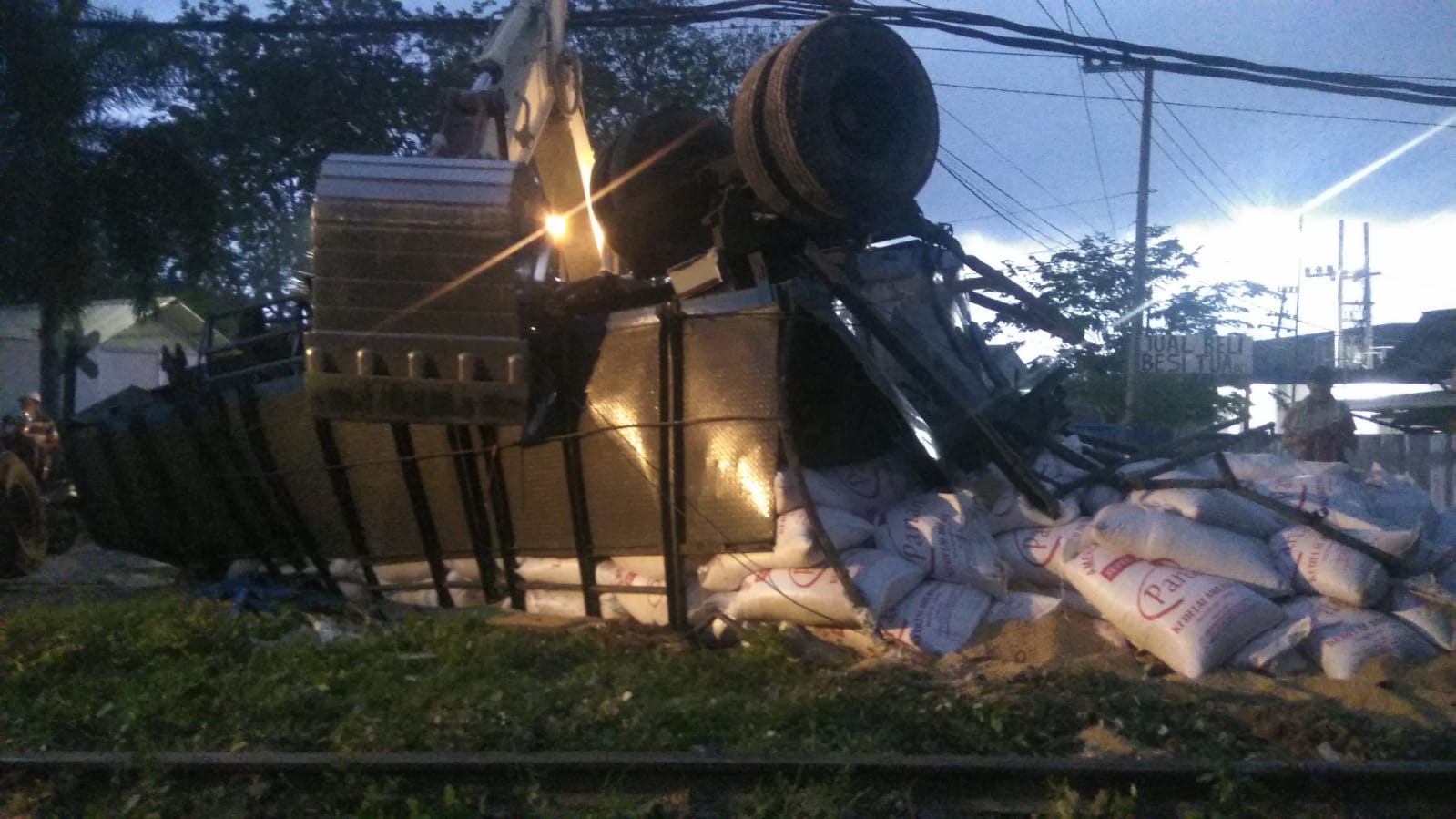 Kendati truk bagian belakang tertabrak kereta api yang melaju namun untung sopir truk selamat dari kecelakaan ini. Kedelai muatan berhamburan akibat truk terguling.