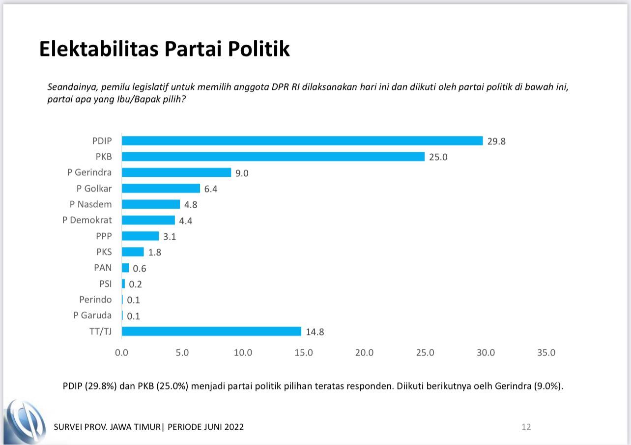Seperti ramai diberitakan, Charta Politika merilis hasil survei di Jawa Timur, periode 24-30 Juni 2022, dengan jumlah responden 1.200 pada tingkat kepercayaan 95 persen dan margin of error +- 2,83 persen. Setelah PDIP, di posisi kedua ada PKB dengan 25 persen, Gerindra 9 persen, Golkar 6,4 persen, NasDem 4,8 persen, Demokrat 4,4 persen, PPP 3,1 persen, PKS 1,8 persen, dan partai-partai lain di bawah 1 persen. (dn/rmc)