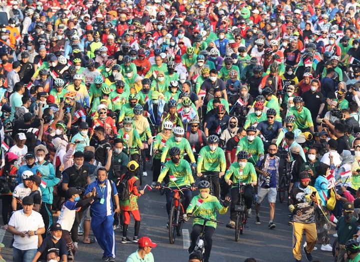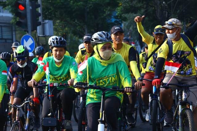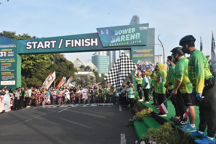 Sekitar dua puluh ribu masyarakat dari berbagai daerah dan komunitas di Jawa Timur, memadati Jalan Gubernur Suryo untuk gowes bareng Gubernur Khofifah Indar Parawansa dalam rangka memeriahkan Tahun Baru Islam 1 Muharram 1444 H. Minggu pagi (31/7/2022).