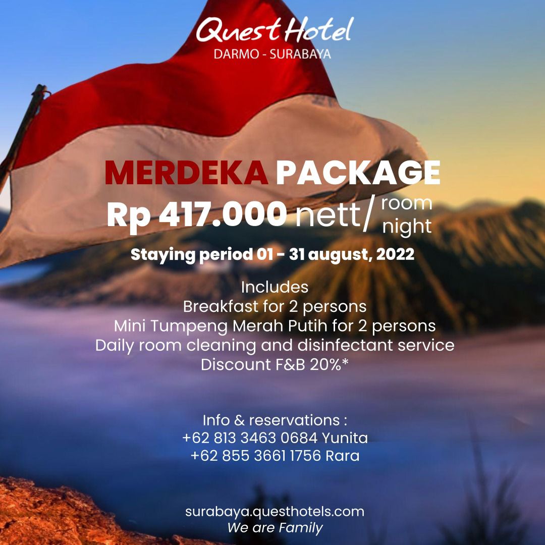SURABAYAPAGI.COM, Surabaya : Menyambut dan memeriahkan Hari Ulang Tahun Kemerdekaan Republik Indonesia yang ke-77, Quest Hotel Darmo Surabaya menghadirkan suguhan menarik untuk membangkitkan kembali dunia pariwisata melalui program promo kamar dan food & beverage.
