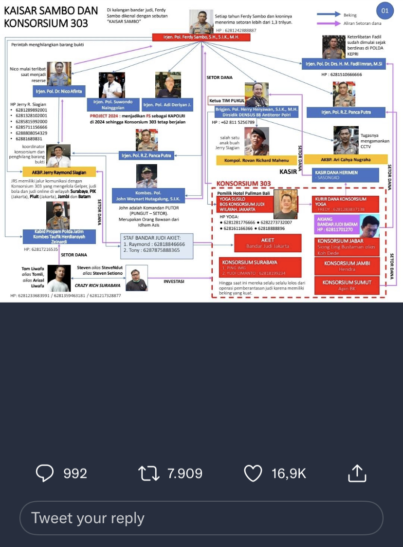 Akun ini menyebarkan 4 gambar grafik Kaisar Sambo yang sudah disukai 8.395 dan dicuit ulang sebanyak 3.900 kali. Gambar tersebut beredar lengkap dengan nomor HP para pejabat Polri dan sipil yang terlibat.